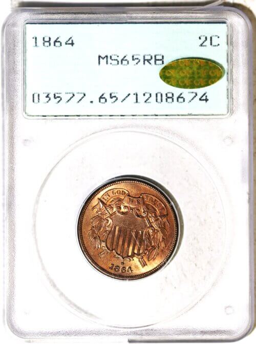1864 2C MS65 RED & BROWN PCGS (CAC) GOLD 1ST GENERATION