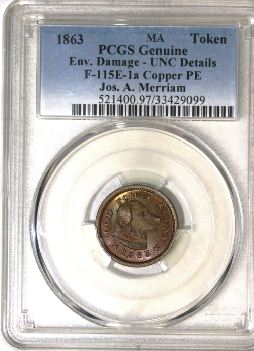 1863 CIVIL WAR MERCHANT TOKEN F-115E-1a JOS. A, MERRIAM NGC UNC. DETAILS