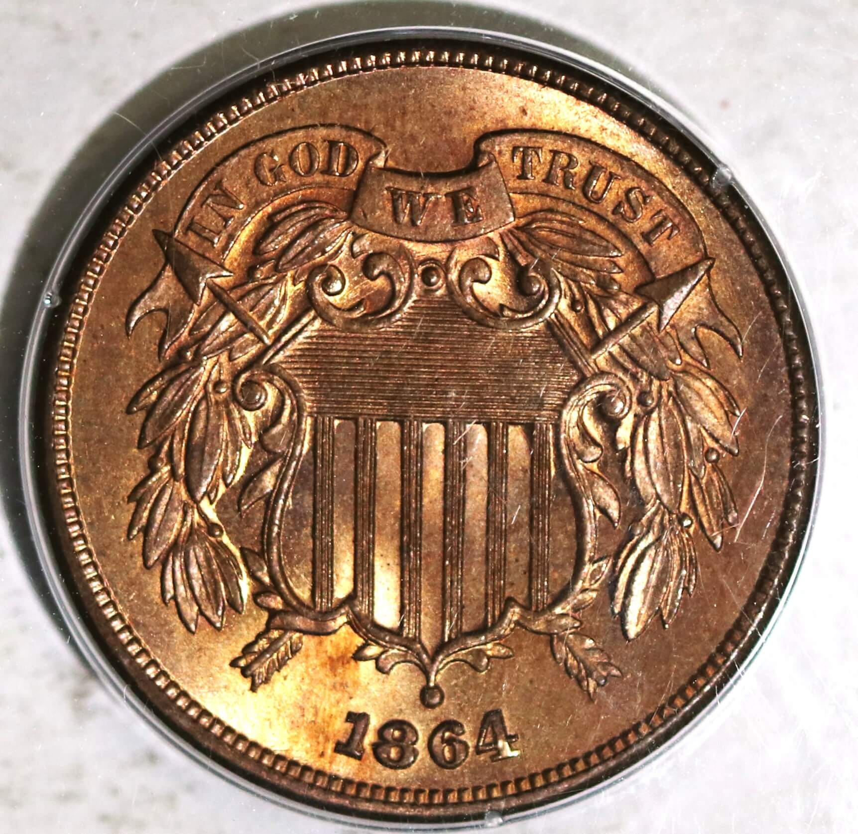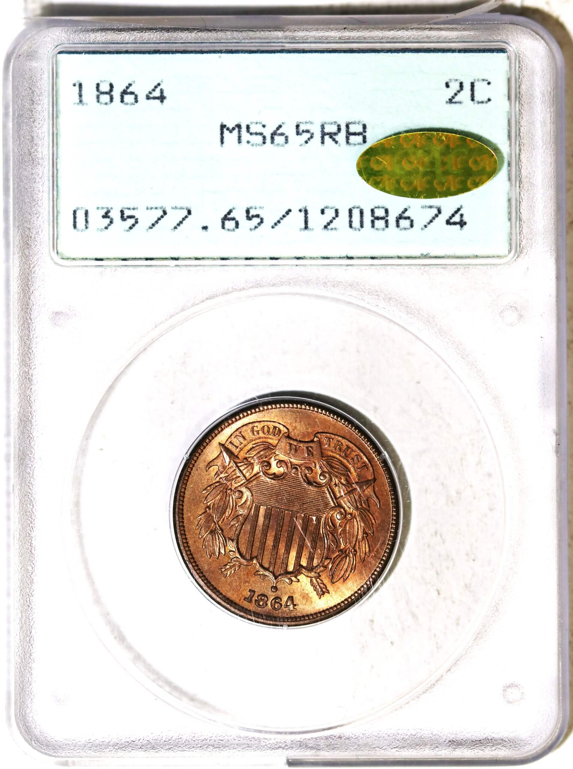 ABSOLUTELY SUPERB TWO-CENT PIECE WITH GREAT RED FIELDS AND GIVEN THE PRESTIGE GOLD (CAC) STICKER. FIRST GENERATION