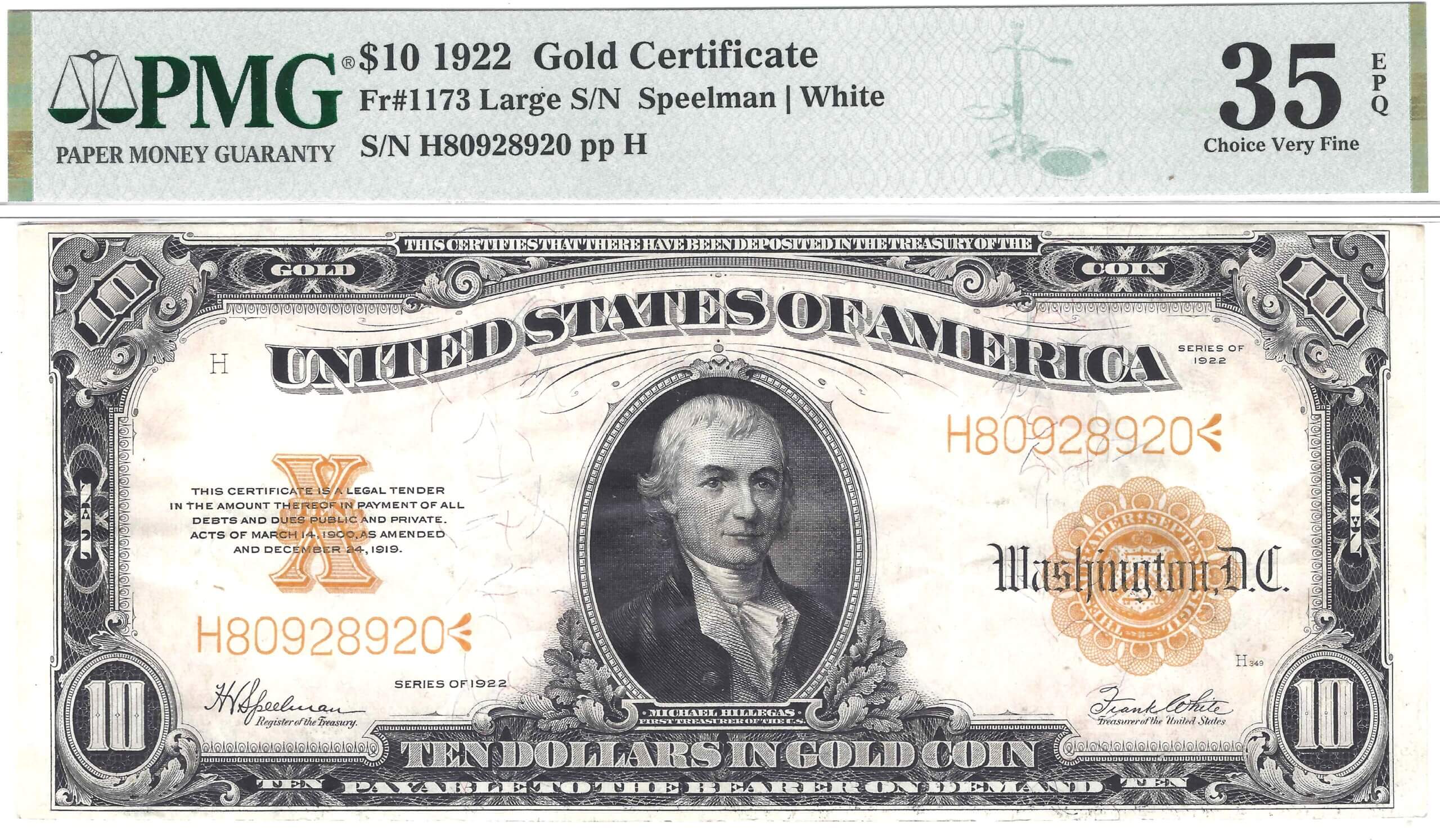 Fr.1173 $10 1922 GOLD CERTIFICATE PMG 35 EPQ