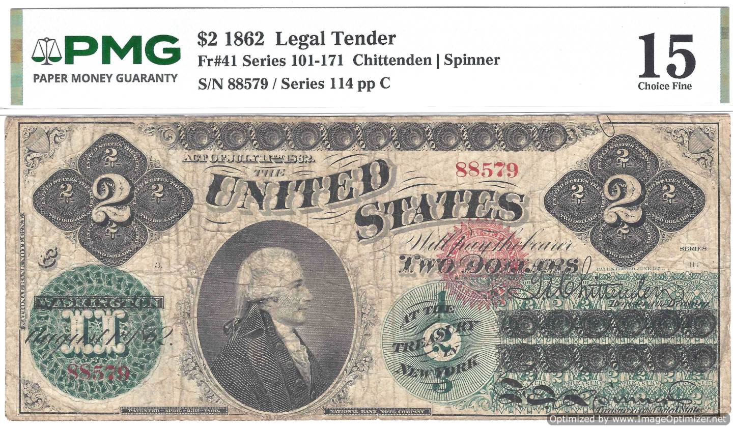 Fr#41 Series 101-171 $2 1862 LEGAL TENDER PMG15