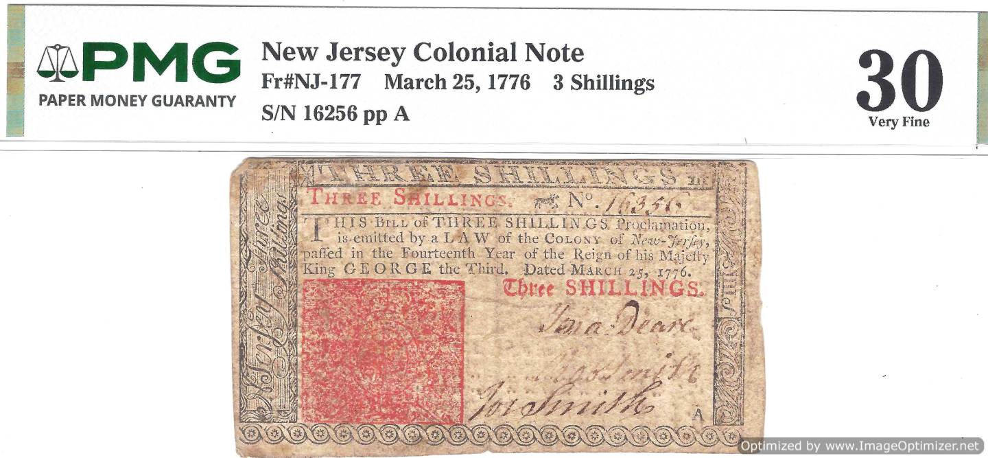 Fr#NJ-177 MARCH 25, 1776 3 Shillings PMG30 quantity