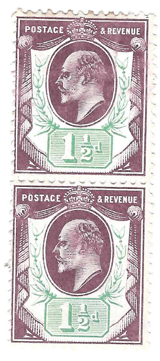 GREAT BRITIAN 1902-11 1 1/2 P Violet & Green (SCOTT 129)Vertical Pair (Bottom Stamp Unhinged) quantity